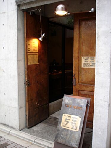 MIHO MUSEUMのあとは、京都に戻り、二条城近くのカフェを訪れました。CAFE HERONです。無機質なコンクリートの打ちっぱなしの壁と、古い木の扉が、中の通路へと・・・